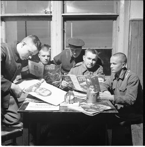 The prisoners, the Inkerian Finns, are reading Finnish magazines.